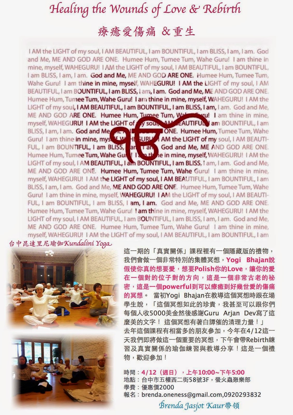 Sat Nam heart 表情符號 這一期台中的「真實關係」課程裡有一個隱藏版的禮物,我們會做一個非常特別的集體冥想,Yogi Bhajan說假使你真的想要愛,想要Polish你的Love,讓你的愛在一個對的位子對的方向,這是一個非常古老的祕密,這是一個powerful到可以療癒到好幾世愛的傷痛的冥想。 當初Yogi Bhajan在教導這個冥想時跟在場學生說,「這個冥想如此的珍貴,我甚至可以跟你們每個人收5000美金然後感謝Guru Arjan Dev寫了這麼美的文字! 這個冥想有著白譚催的清理力量!」